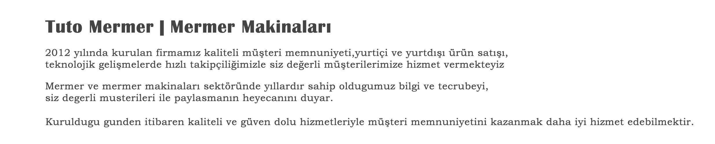 Bütün mermer makinaları, yedek parçaları, vinçler, su arıtma sistemleri bloklar, plakalar, ebatlanmış mermer ve ekipmanları ve her turlü ihracat malzemesinin tedarik edilmesinide kapsamaktadır. Satış sonrası hizmetlerimiz yurt ici ve yurt dısınıda kapsamaktadır.